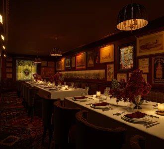 Drenched in deep crimson and surrounded by railroad artifacts decorating its upholstered walls, the Dining Salon at The Big Four has the plush trappings of a private rail varnish.