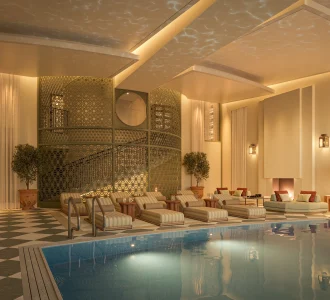 A glass top over the sparkling atrium pool, Moorish fretwork wall, and arresting city panoramas deliver an uncommonly elegant backdrop for memorable celebrations.